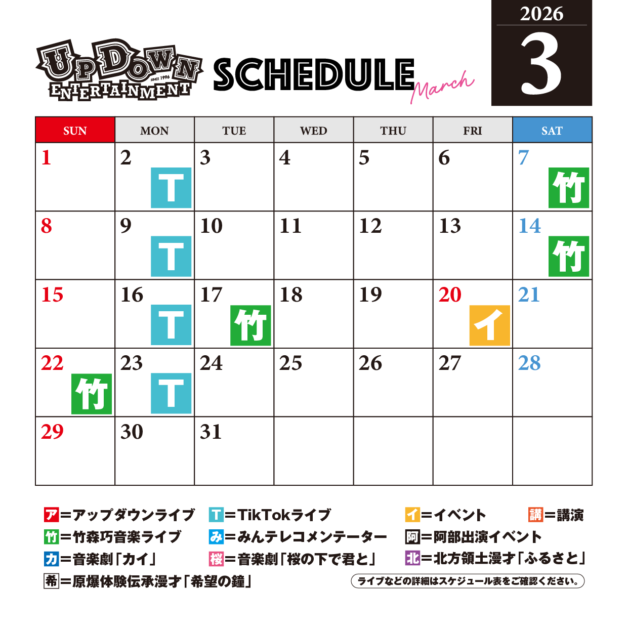 竹森巧トークライブ 「未来のために仕事を志事にする!エンタメが志事になった日2026」 チラシ画像▶︎ 日時:2026年3月7日(土) 開場:15:30/開演:16:00〜17:15 場所:千葉市生涯学習センター3F/特別会議室 定員:30名 料金:2,000円 https://updown-official.stores.jp/items/6976debcb5a95966d8036882 問合わせ:(いやさか) updn.info@gmail.com |