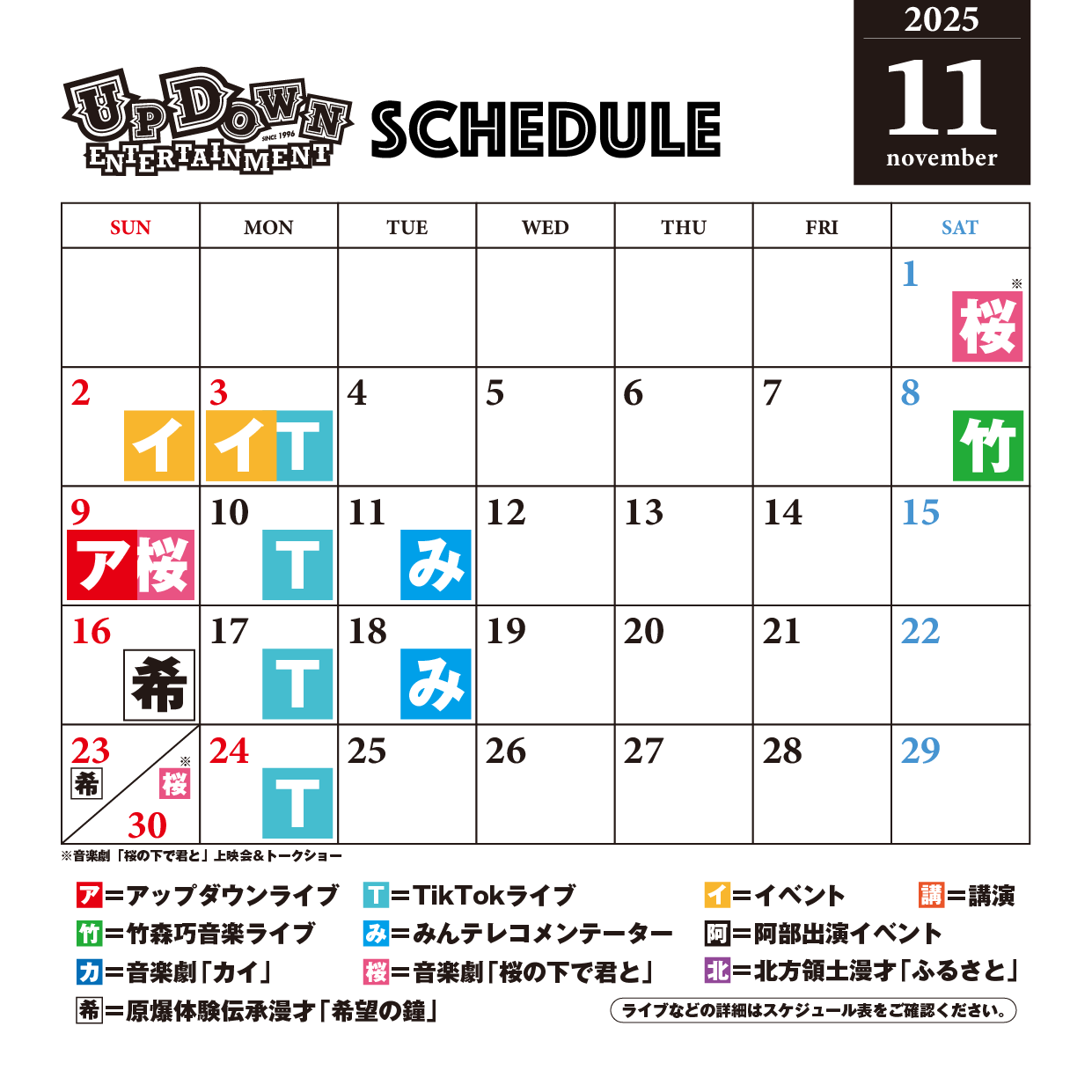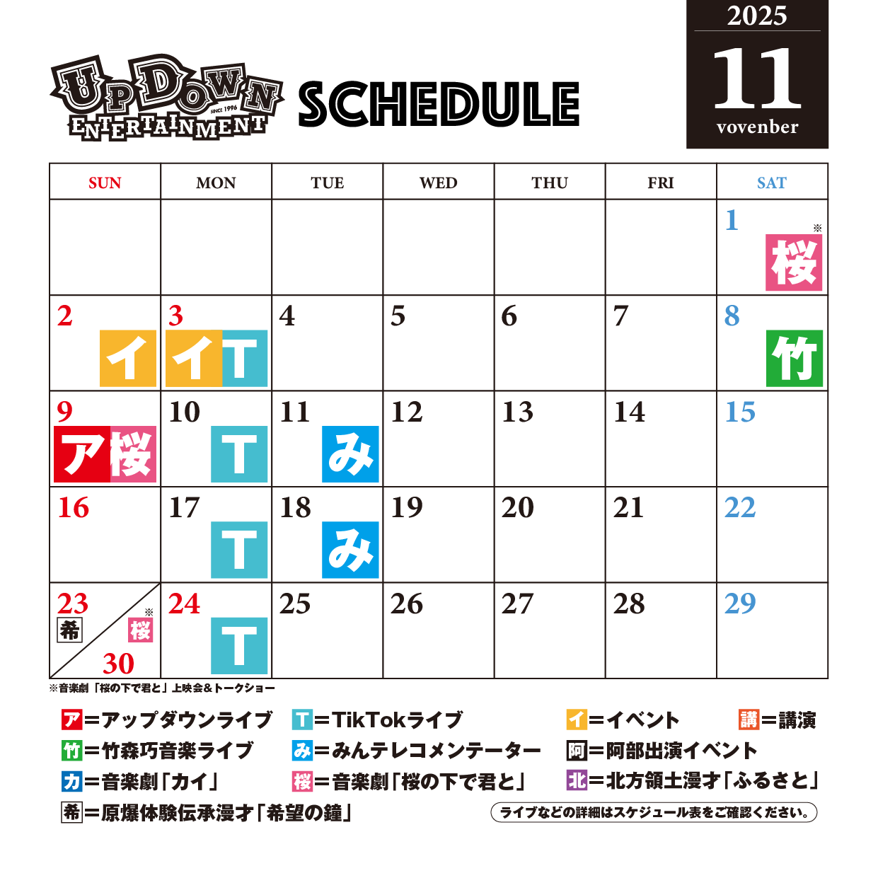 | 2025年11月30日(日) | アップダウン二人芝居「音楽劇 桜の下で君と」 開場 12:15/開演 13:00 |