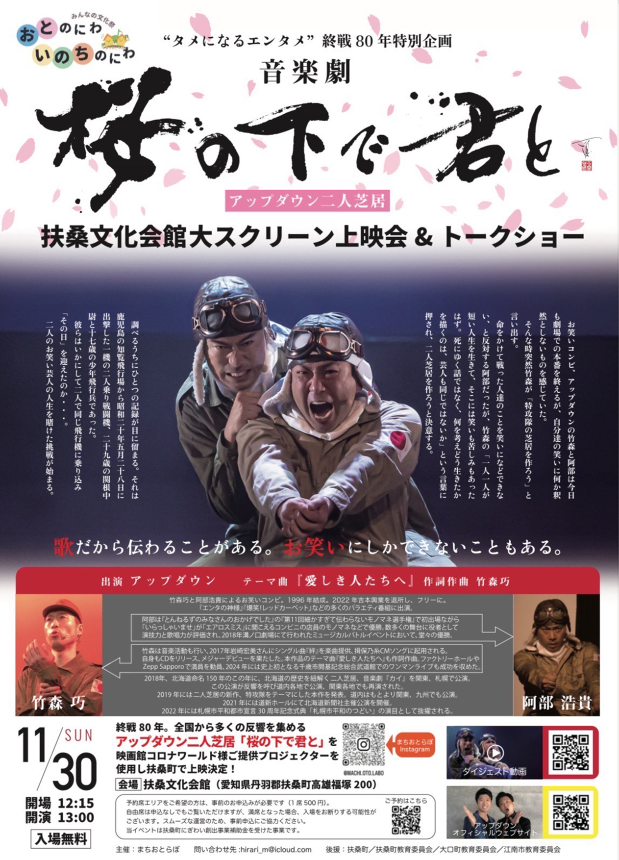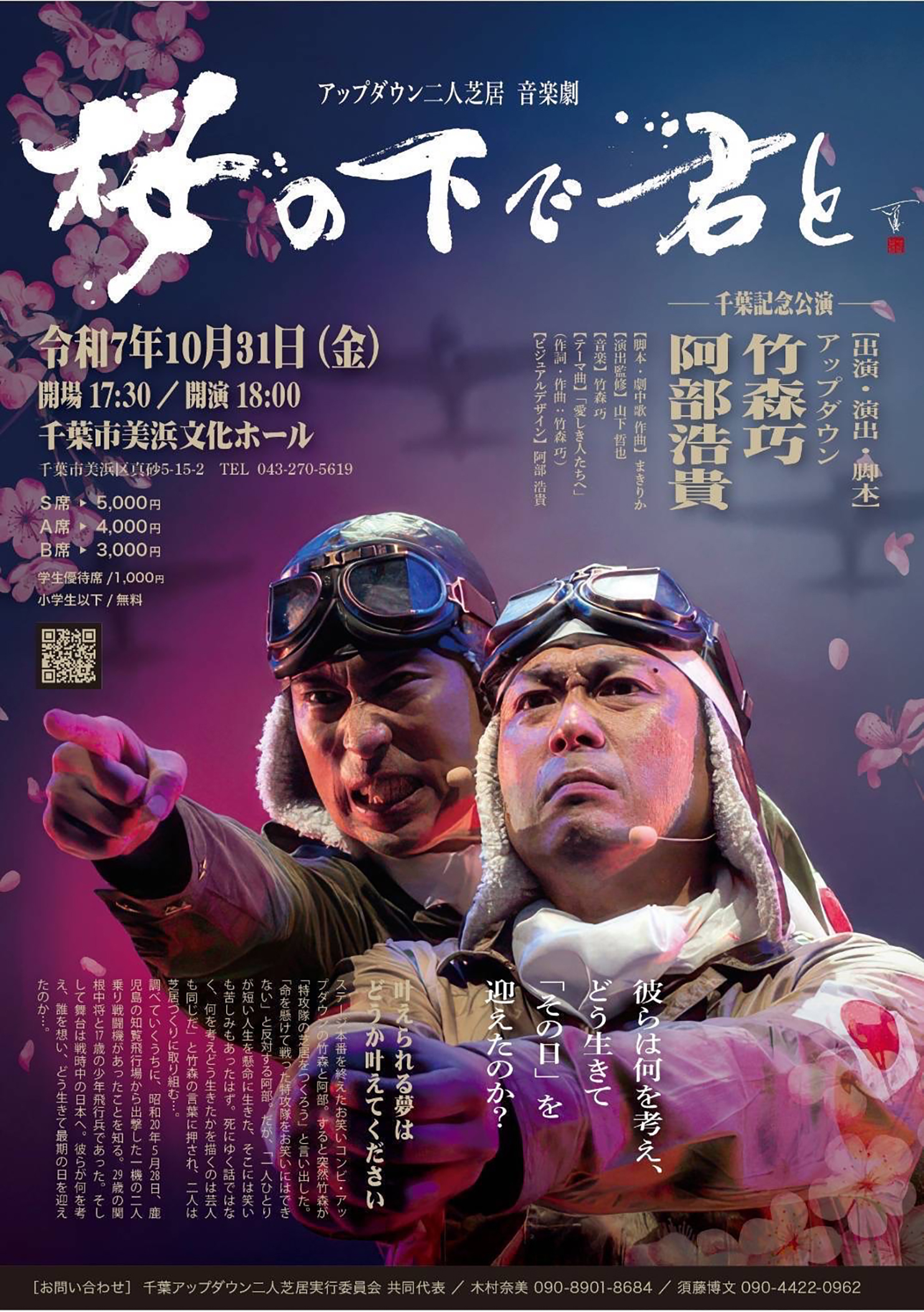| 2025年10月31日(金) | アップダウン二人芝居・音楽劇「桜の下で君と」千葉記念公演 チラシ画像▶︎ 会場:千葉市美浜文化ホール(千葉市美浜区真砂5-15-2) |