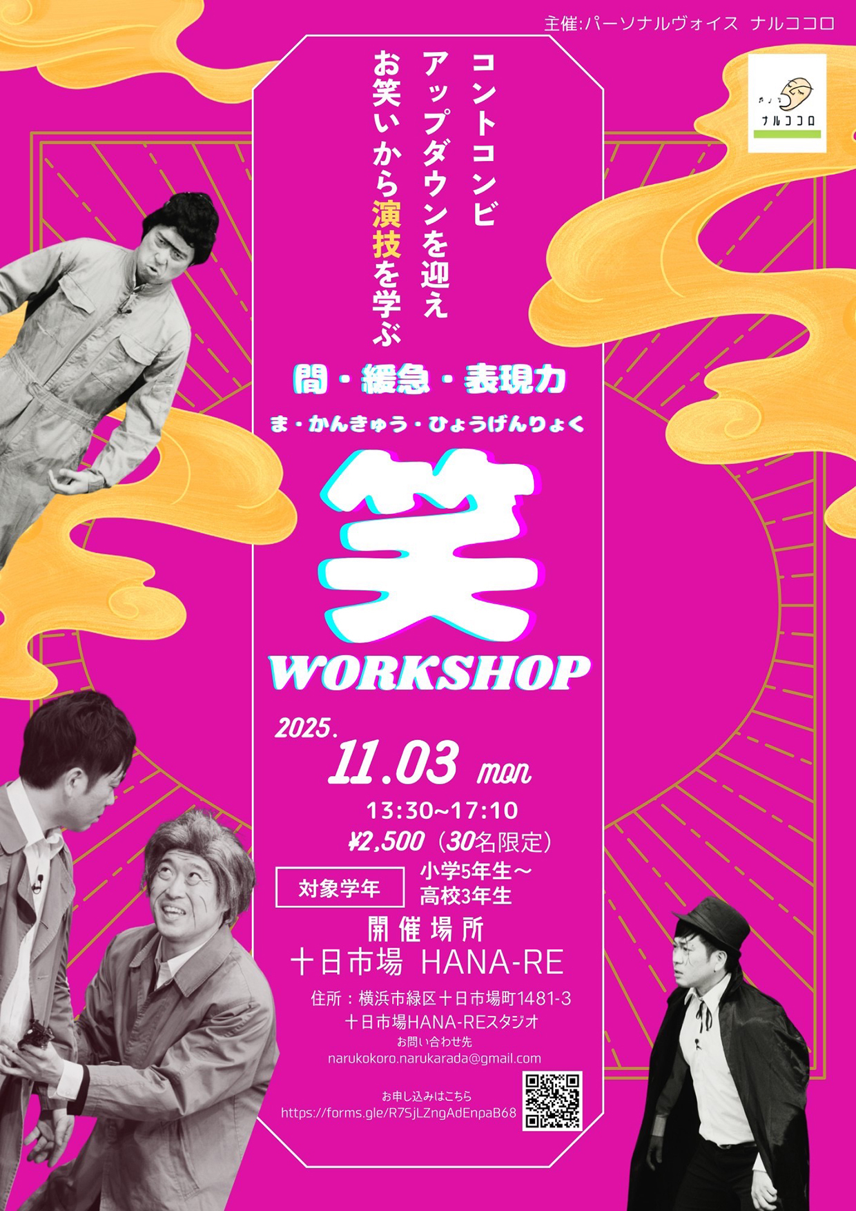 | 2025年11月3日(月) | お笑いから学ぶ演技ワークショップ チラシ画像▶︎ 会場:十日市場HANA-RE |