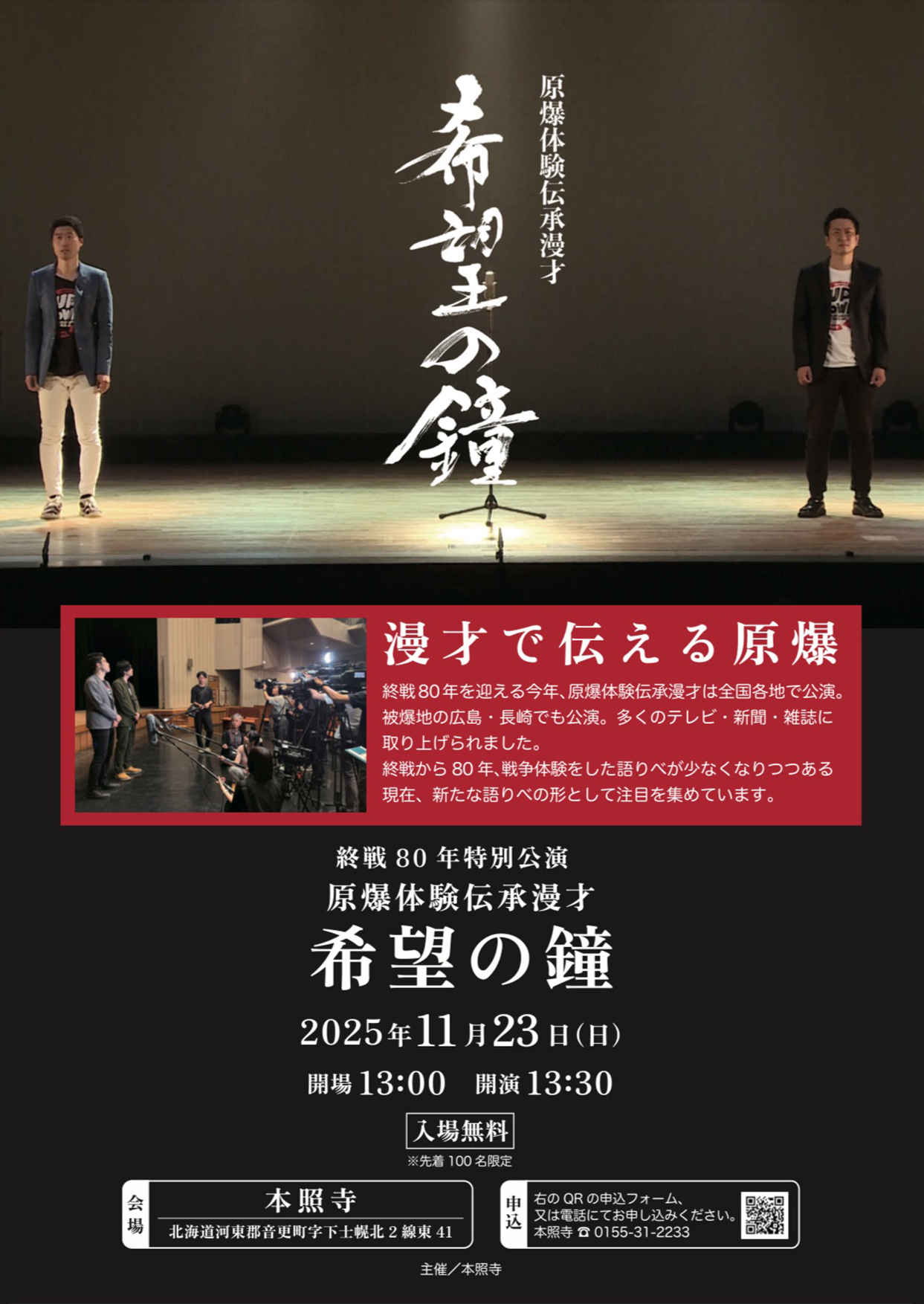 | 2025年11月23日(日) | 終戦80年特別公演 原爆体験伝承漫才「希望の鐘」 チラシ画像▶︎ 開場 13:00/開演 13:30 |