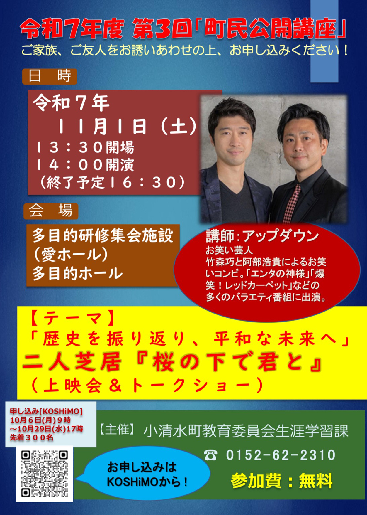 | 2025年11月01日(土) | 第3回町民公開講座「歴史を振り返り、平和な未来へ」 開場 13:30/開演14:00 |