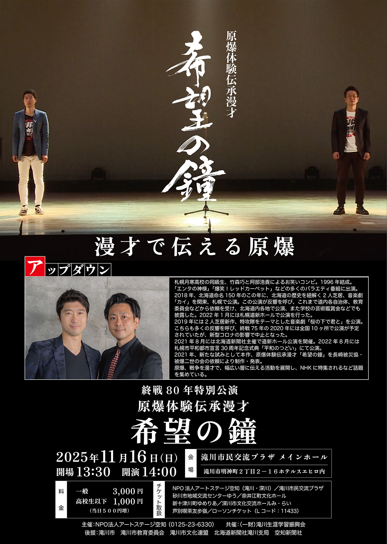 | 2025年11月16日(日) | 終戦80年特別公演 原爆体験伝承漫才「希望の鐘」 チラシ画像▶︎ 開場 13:30〜/開演 14:00〜 |