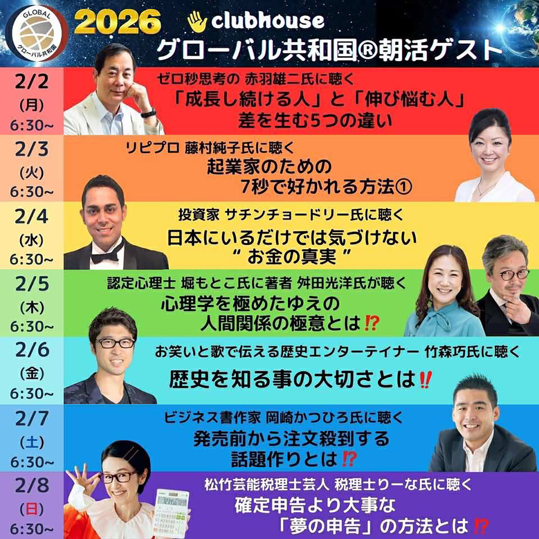 Clubhouse グローバル共和国<竹森巧朝活ゲスト登壇> チラシ画像▶︎ 日時:2026/2/6(金) 時間:6:30〜7:15 |