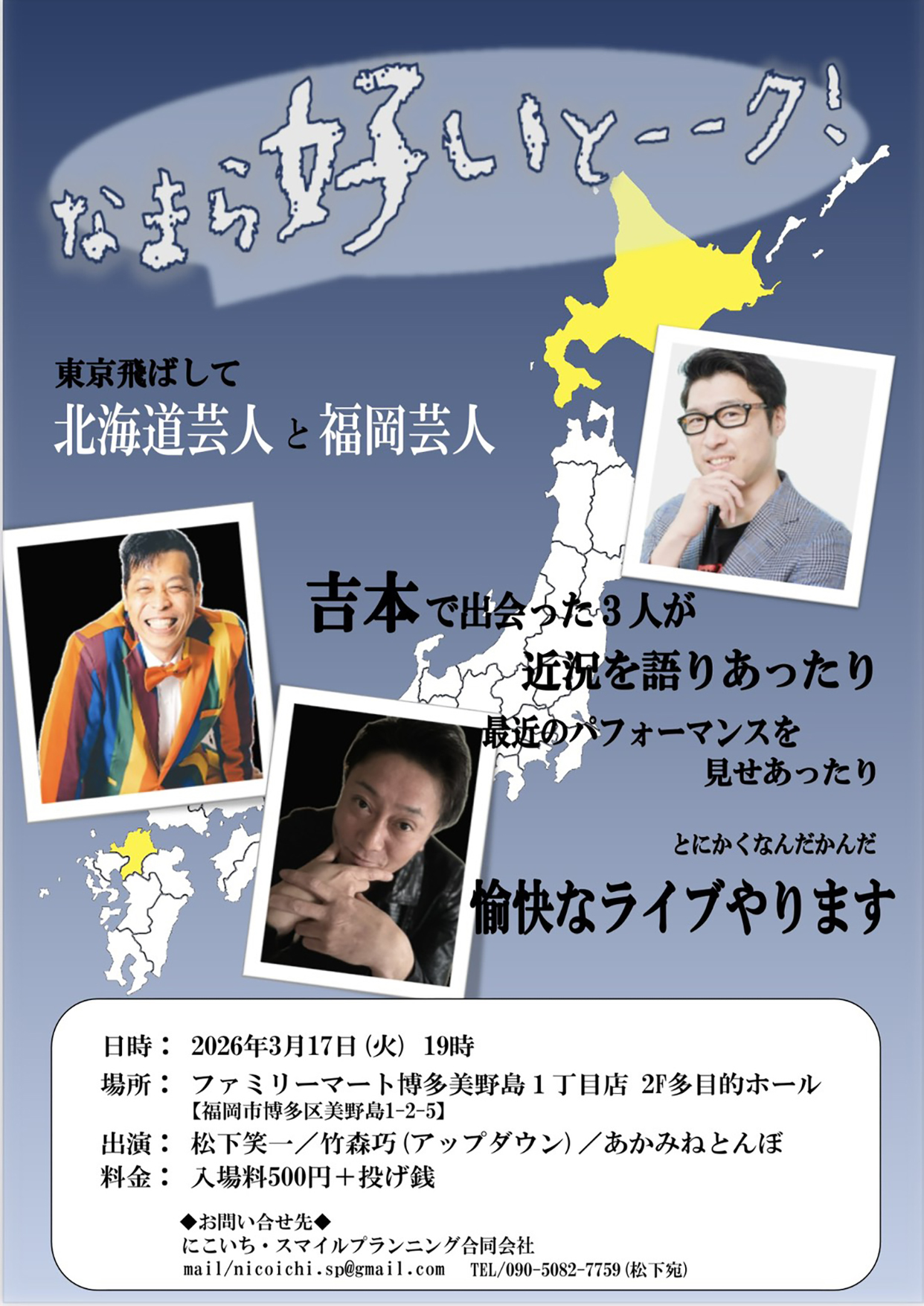 なまら好いとーーク! チラシ画像▶︎ 日時:2026年3月17日(火) 開演:19時 場所:ファミリーマート博多美野島1丁目店2F多目的ホール(福岡市博多区美野島1-2-5) 出演:松下笑一/竹森巧(アップダウン)/あかみねとんぼ 料金:入場料500円+投げ銭 お問合せ:にこいち・スマイルプランニング合同会社 Mail:nicoichi.sp@gmail.com/Tel:090-5082-7759(松下) |