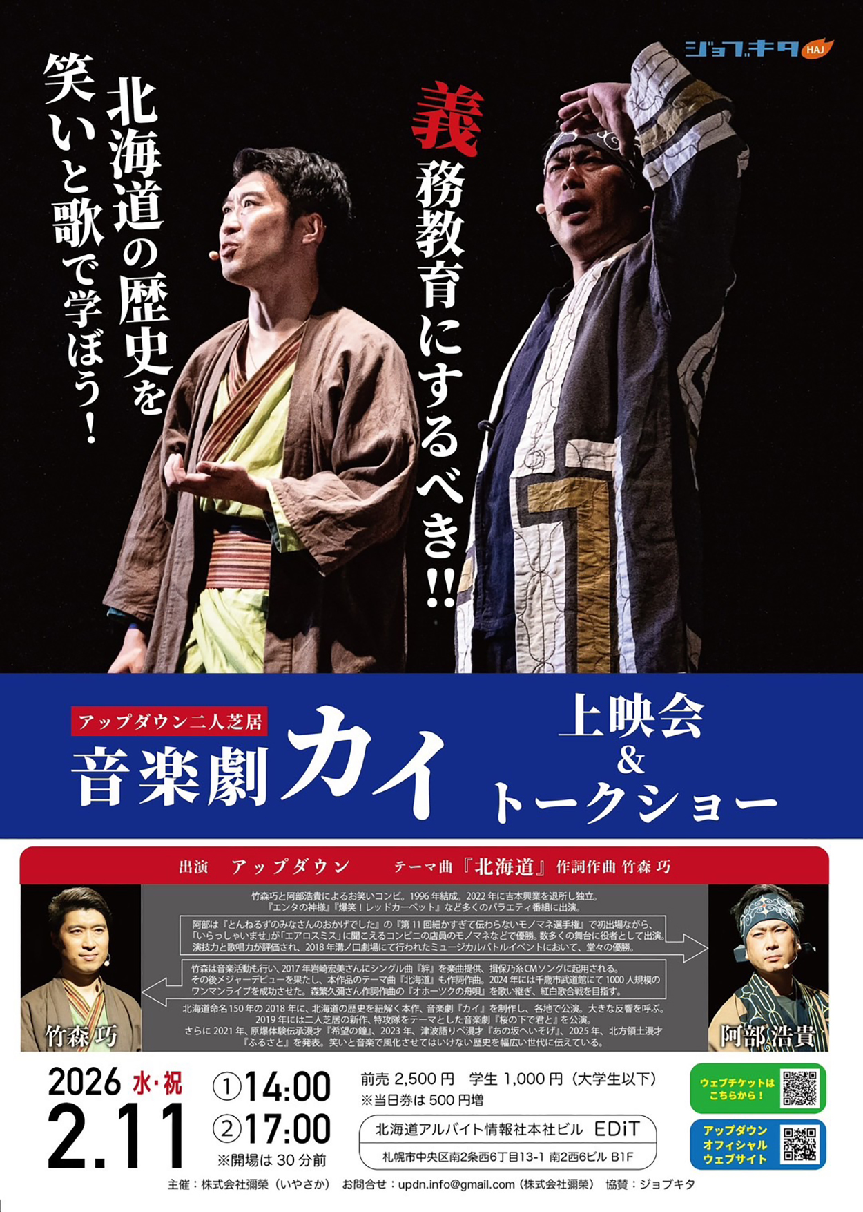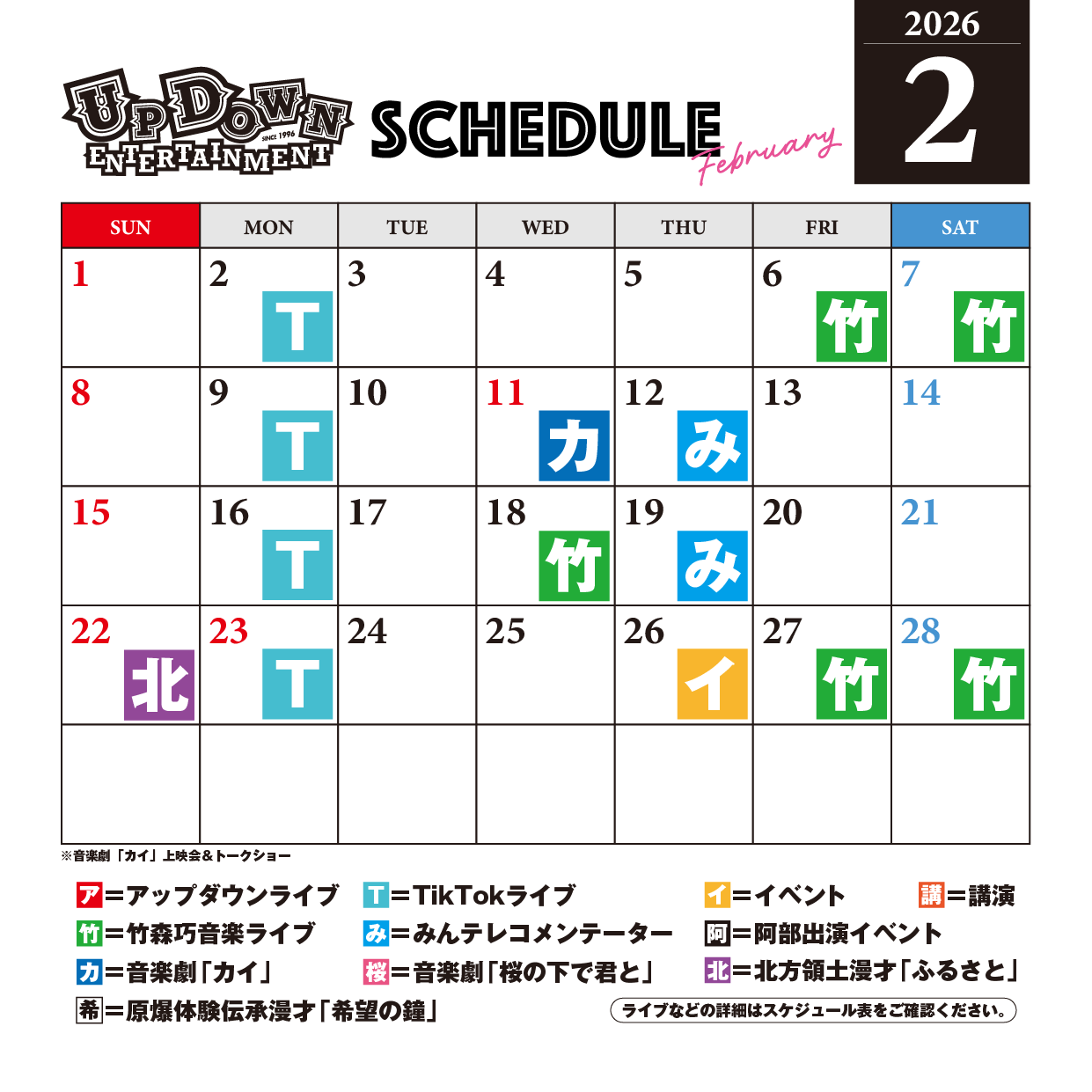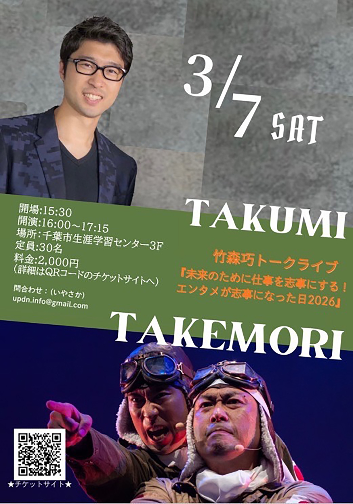 竹森巧トークライブ 「未来のために仕事を志事にする!エンタメが志事になった日2026」 チラシ画像▶︎ 日時:2026年3月7日(土) 開場:15:30/開演:16:00〜17:15 場所:千葉市生涯学習センター3F/特別会議室 定員:30名 料金:2,000円 https://updown-official.stores.jp/items/6976debcb5a95966d8036882 問合わせ:(いやさか) updn.info@gmail.com |