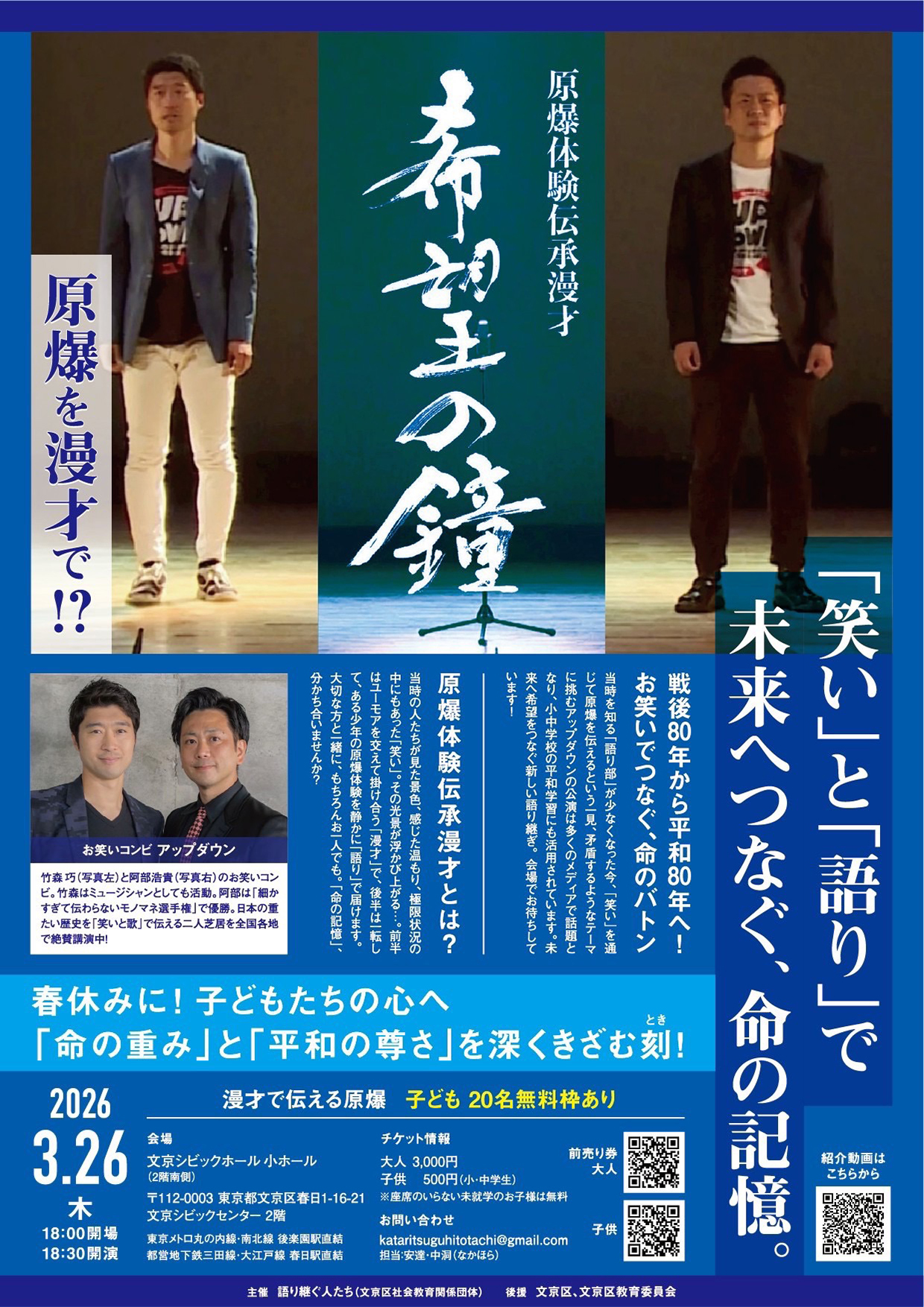 原爆体験伝承漫才「希望の鐘」 チラシ画像▶︎ 会場:文京シビックホール小ホール (東京都文京区春日1-16-21 文京シビックセンター2階) ※都営地下鉄三田線·大江戸線 春日駅直結 時間:18:00開場/18:30開演 前売り券:大人 3,000円/子供 500円(小·中学生) <オンラインチケットはこちら> https://updown-official.stores.jp/items/6974122ea1be0ecfbe336487 ※座席のいらない未就学のお子様は無料 主催 :語り継ぐ人たち(文京区社会教育関係団体) 後援 :文京区、文京区教育委員会 お問い合わせ:kataritsuguhitotachi@gmail.com 担当 安達・中洞(なかほら) |