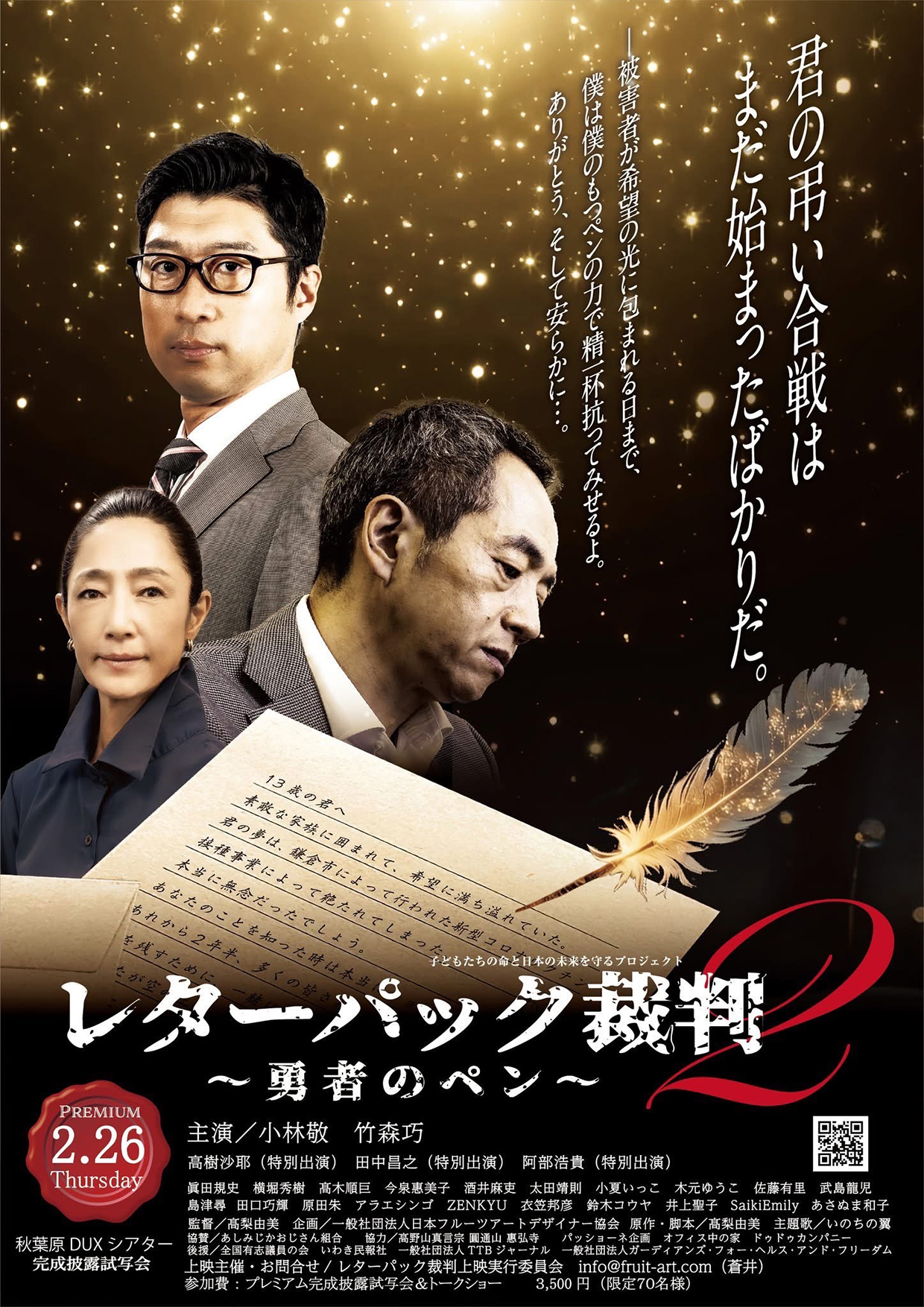 レターパック裁判2〜勇者のペン〜 「東京プレミアム完成披露試写会」 チラシ画像▶︎ 日時:2026年2月26日(木) 時間:10:00〜13:00 料金:3,500円 場所:秋葉原UDXシアター(千代田区外神田4-14-1-4F) 予約・問合せ:上映実行委員会 info@fruit-art.com <参加申し込みページはコチラをクリック> |