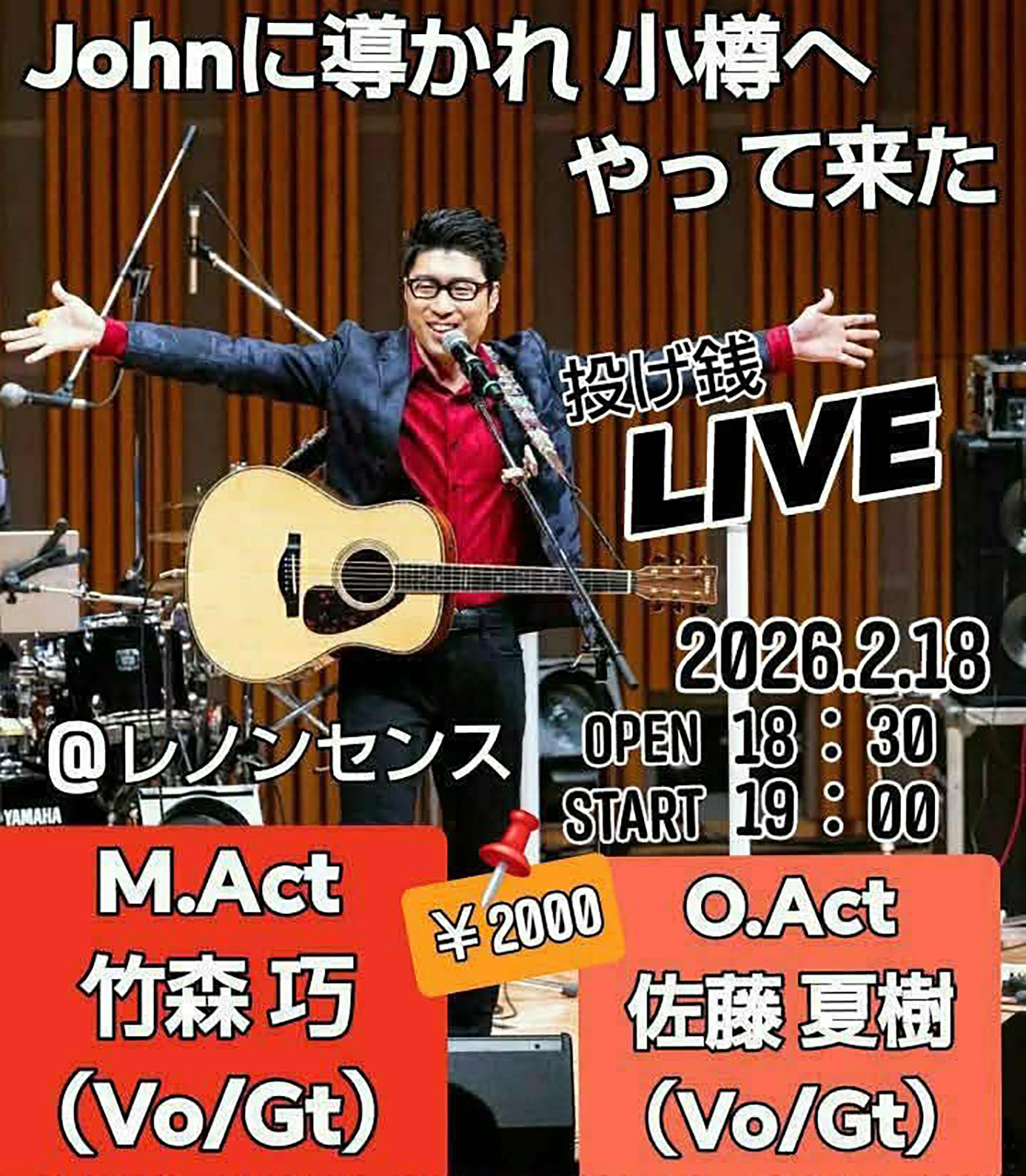 Jhonに導かれ小樽へやって来た 竹森巧ライブ チラシ画像▶︎ 日時:2026年2月18日(水) 時間:18:30 オープン/19:00 スタート 入場料:2,000円(※ライブは投げ銭となります) 場所:Rock City Bar レノンセンス(小樽市花園3丁目8-12) 予約・問合せ:updn.info@gmail.com(いやさか) |