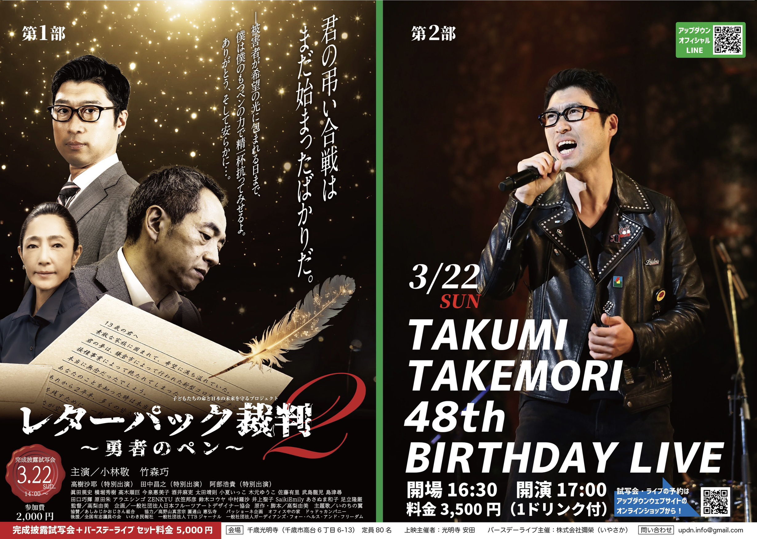 映画「レターパック裁判2~勇者のペン~」千葉完成披露試写会 (上映会&トークショー) チラシ画像▶︎ 日時:2026年3月7日(土) 開場:18:00/開演:18:15〜20:45 場所:千葉市生涯学習センター内ホール(千葉県千葉市中央区弁天3丁目7-7) <当日スケジュール>(予定) ・18時00分 受付開始 ・18時15分 上映会開始(※映画上映時間=約102分) ・上映会終了後、高梨由美監督 & 豪華ゲストによるトークセッション ・20時45分 終了 <当日のゲスト> ・高梨由美監督 ・竹森巧氏(アップダウン)※w主演「浜田弘樹」役 ・眞田規史氏(俳優)※「中嶋竜也」(市議会議員)役 ・古佐古基史氏(ハープ奏者・作曲家・即興演奏家)※本映画、オリジナル楽曲提供 ■チケット料金: ①3,000円(鑑賞券) ②5,700円(鑑賞券・ペア券) ③2,500円(鑑賞券・ありがとう多古町/多古町住民様限定) ※6歳以下無料です ◾️お申込み◾️ https://letterpack2-chiba.peatix.com/ 【スペシャル特典】 同会場の2階で行われる 竹森巧トークライブ(16時スタート)と 映画完成披露試写会、両方ご参加される方には特典として、 竹森巧CDアルバムをプレゼントいたします! ※トークライブは30名限定となっておりますのでお早めにお申し込みください https://updown-official.stores.jp/items/6976debcb5a95966d8036882 |